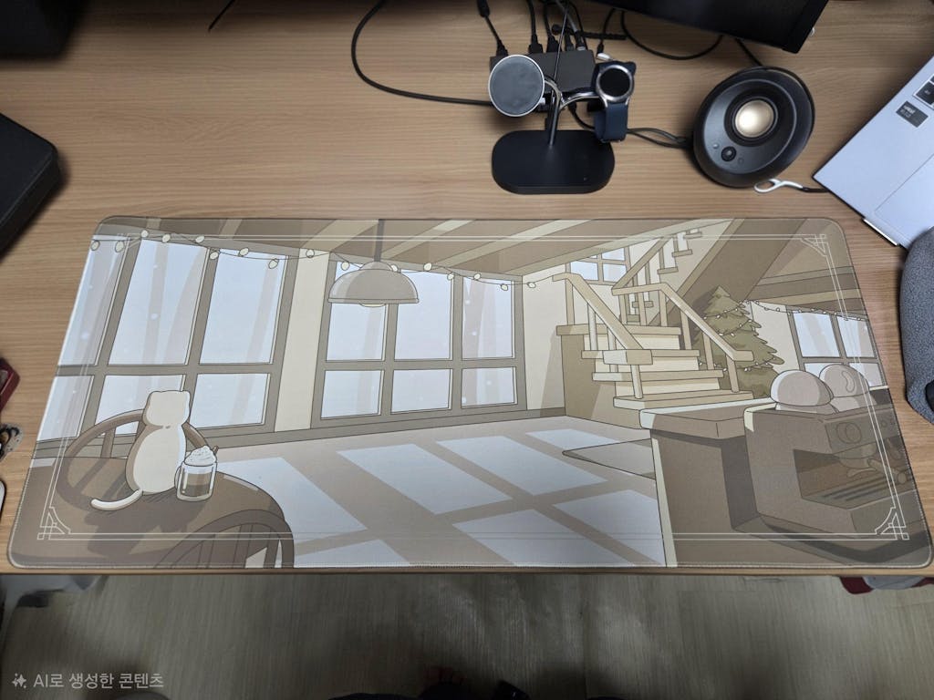 But the deskmat itself is satisfying. I like the contrast between the cold, snowy weather outside the window and the warm, cozy café interior, and I especially love the cute cat and the mocha latté on the left.